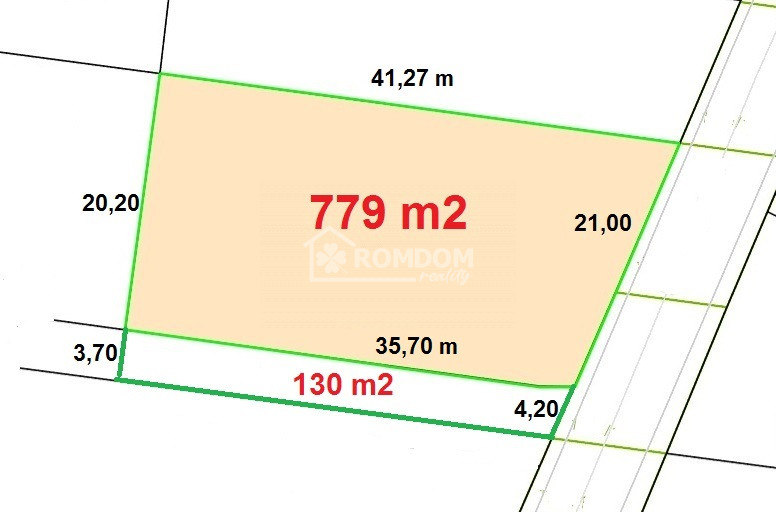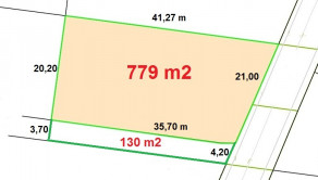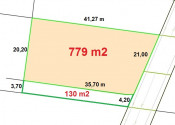 Stavebný pozemok má výmeru 779 m2 a 1/2 podiel na súkromnej ceste (130m2) je 65 m2.
