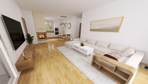 Terénne úpravy záhrady, terasa, parkovacia plocha, plot, brána na diaľkové ovládanie. Príprava na krb, klimatizáciu, fotovoltaiku, vonkajšie žalúzie aj bezpečnostný systém.