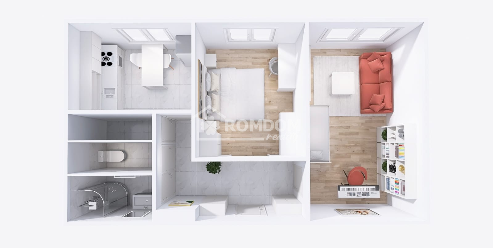 Dispozícia je praktická a funkčná. Vstupná chodba, kúpeľňa, samostatná toaleta, spálňa, obývacia izba, kuchyňa so vstavanou linkou, samostatná komora. Byt má pekný výhľad aj do parku a nachádza sa v pokojnej ulici s minimálnou dopravou.