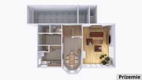 Priestranná obývacia izba s prípravou na krb a výstupom na terasu, samostatná kuchyňa kompletne vybavená spotrebičmi, jedáleň, samostatné WC. Vstup do domu je možný priamo z garáže suchou nohou.